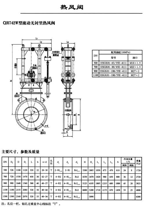 适用于介质温度1000摄氏度以下的高炉热风炉系统。用作热风阀、燃烧阀、烟道阀等。 QR42W型为铸钢或全焊本体,且阀体下部排污为圆管排污形式。具有冷却水腔大,水质要求低的特点,且使用经济。阀门靠介质压差实现密封。 传动方式:卷扬传动形式、液压传动形式、电传动形式。 下角标“T”表示电动推杆。 主要材质:Q235、20g。